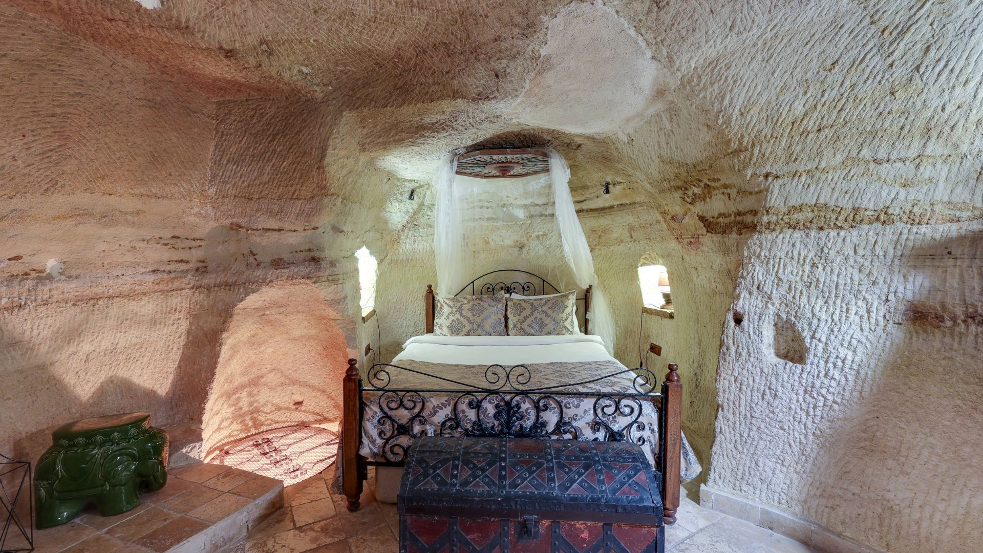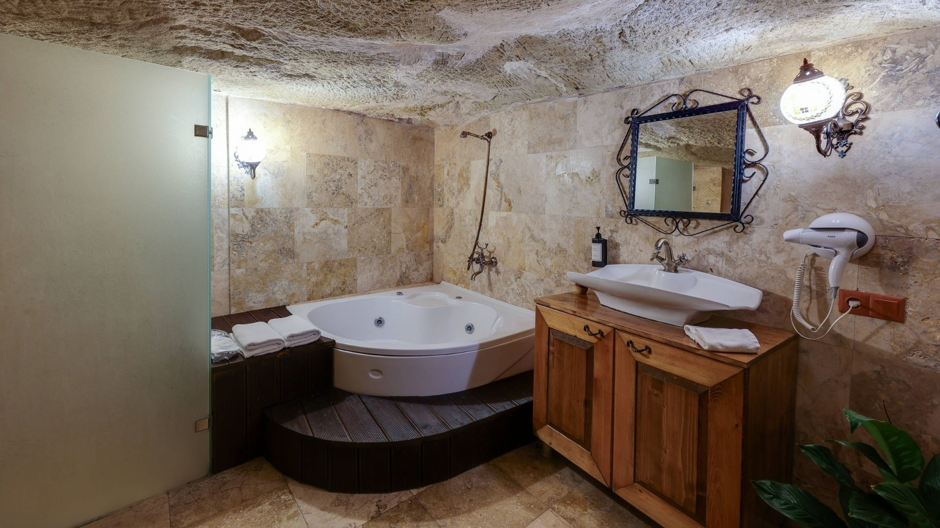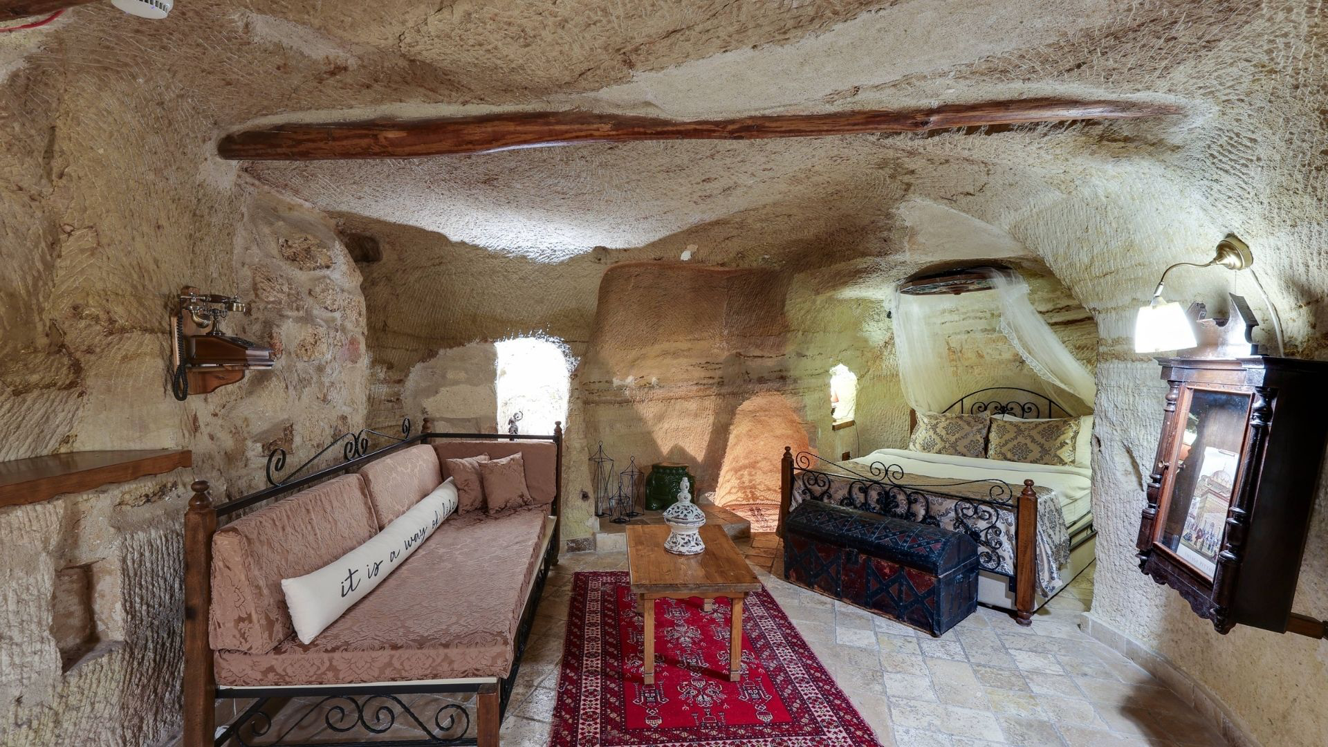 Cam vitrinlerde sergilenen paha biçilmez kitaplar ve loş ışıklarıyla bu oda, entelektüel bir kaçış noktası. Burada bilgelik ve ilham dolu bir dünyanın derinliklerine dalacaksınız. Doğal kaya dokusunun huzurunu hissettiren özgün bir mağara süit. Oda isminden de anlaşılacağı üzere “saklı bir kütüphane” atmosferi taşır; gün boyu serin ve sessiz yapısıyla dinlenmek için idealdir. Modernize edilmiş banyoda jakuzi bulunur; Atelier Rebul banyo ürünleri ise rutininizi zarif bir dokunuşla tamamlar. Konforlu yatak ve oturma alanı, geziden döndüğünüzde keyifli bir mola sunar. Otantik mağara mimarisini modern konforla birlikte deneyimlemek isteyen misafirler için rahat, sakin ve karakterli bir seçenek.